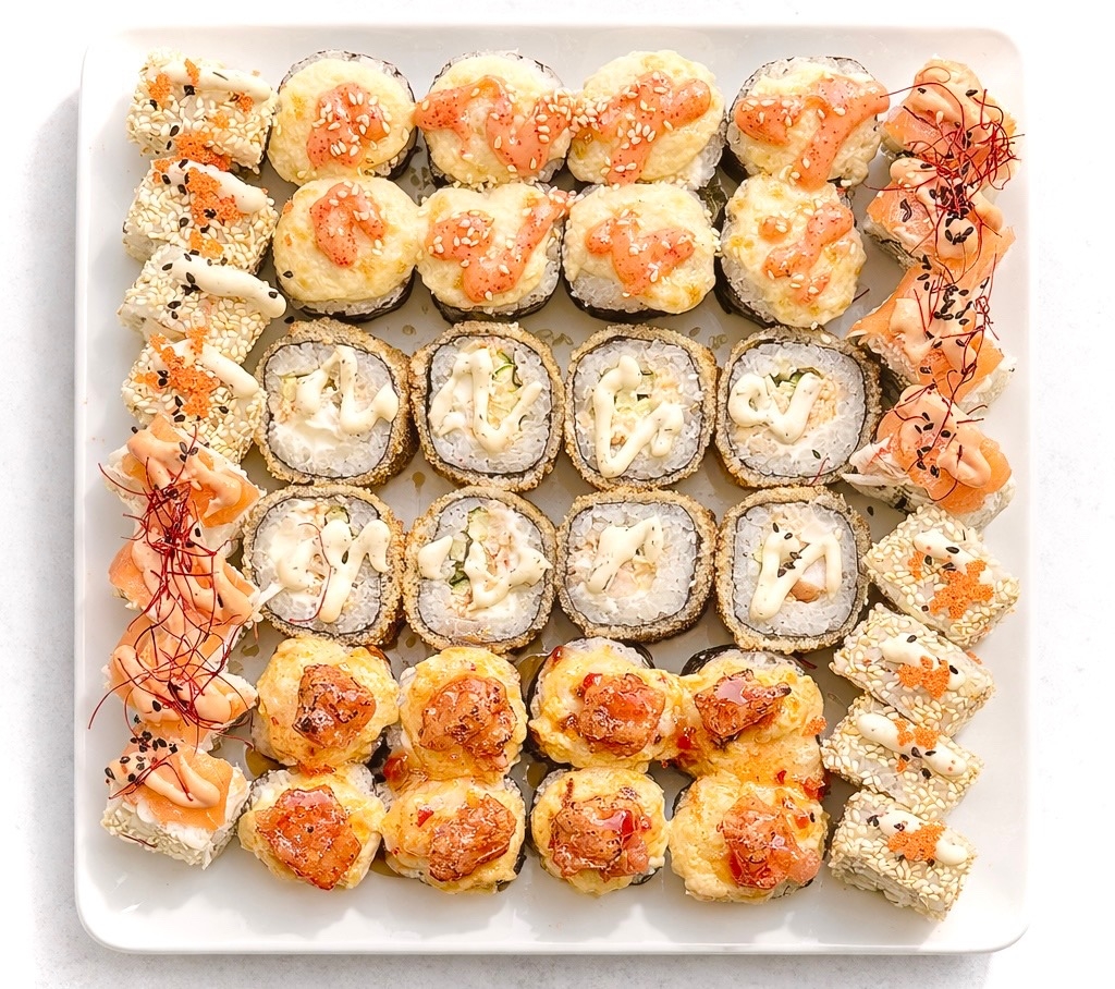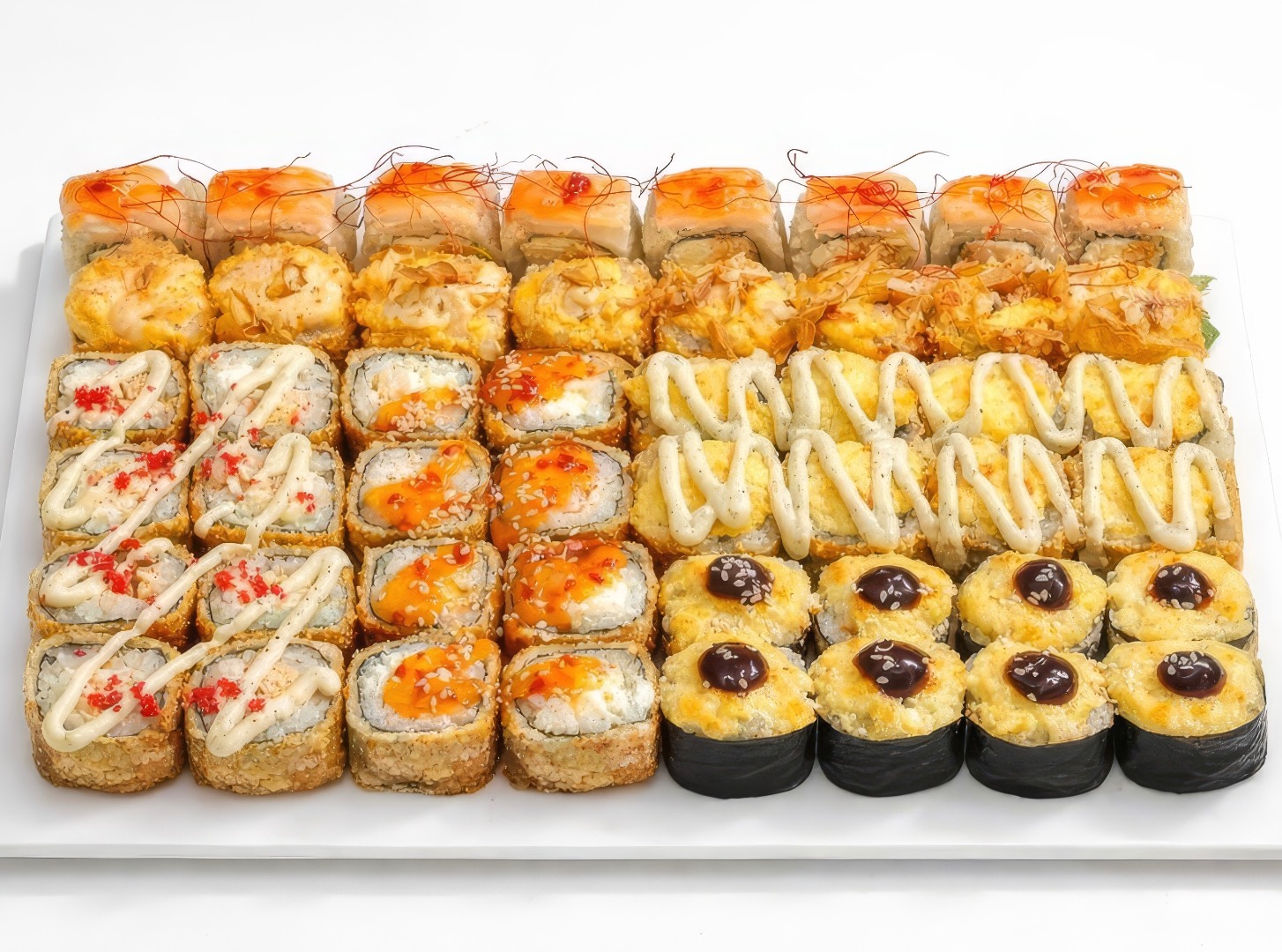 Цена на вынос 1440 рублей-Филадельия с нитями Чили -Запеченный с угрем -Запеченный Самурай <… Открыть составЦена на вынос 1440 рублей-Филадельия с нитями Чили -Запеченный с угрем -Запеченный Самурай - Запеченный ролл под шапочкой лавина с креветкой темпура и сливочным сыром, соусом Унаги и кунжутом - ролл с УГРЕМ, авокадо, шапочкой из сливочного сыра политый соусом Манго, посыпанный Масаго и микро зеленьюЗакрыть состав